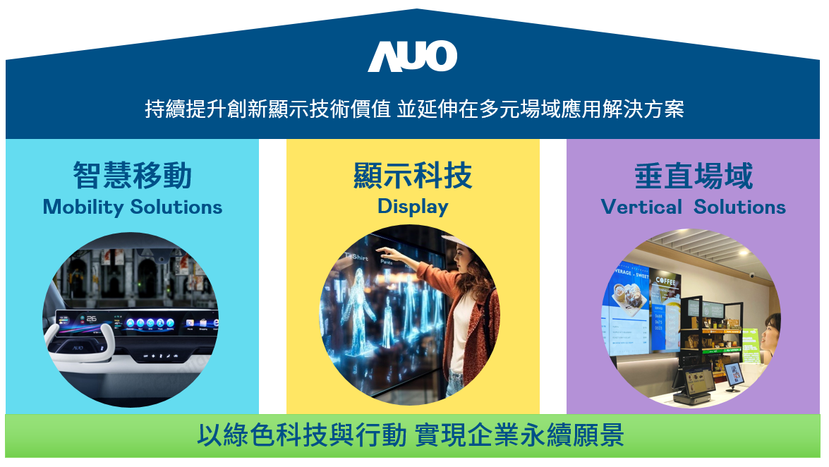 我們持續推動「雙軸轉型」,在精進顯示技術附加價值(Go Premium),與深化垂直市場應用(Go Vertical)的策略下,對應尊龙凯时-人生就是搏的優勢競爭力與趨勢,我們奠定顯示技術智慧移動垂直場域三大永續營運支柱,在顯示技術領域的根基之上,延伸布局多元場域應用解決方案。將先進顯示科技助力智慧移動及垂直場域發展,並以綠色科技與行動為實踐,在轉型之路上貫徹永續經營之願景。